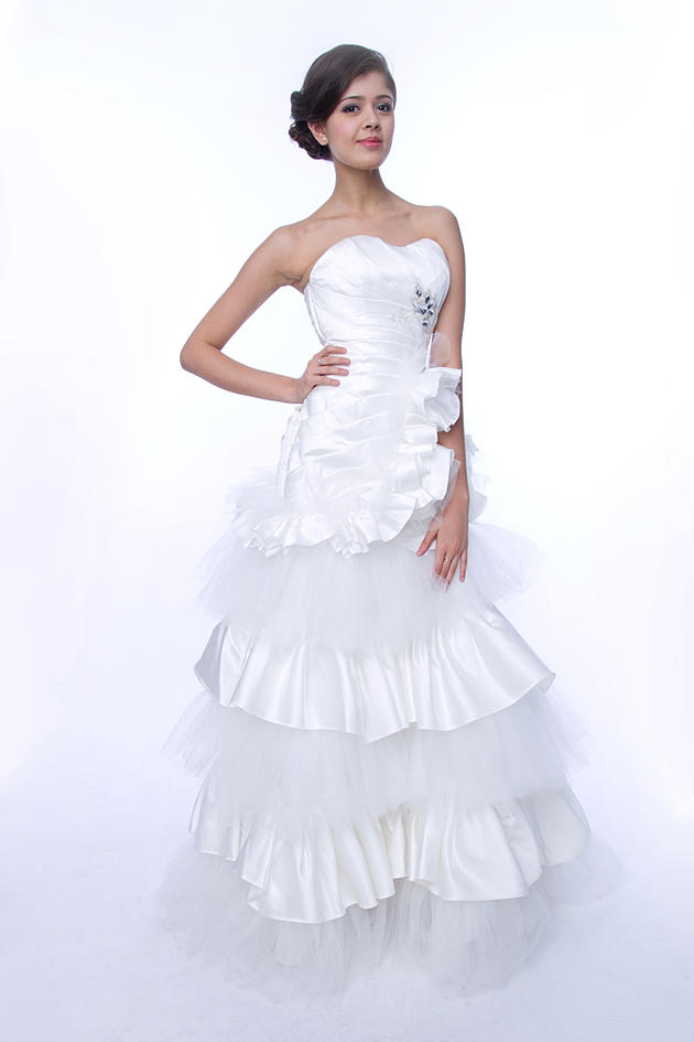4、上半身較胖的新娘挑選婚紗晚裝時最好選質料較硬挺,色彩較沉穩的設計。